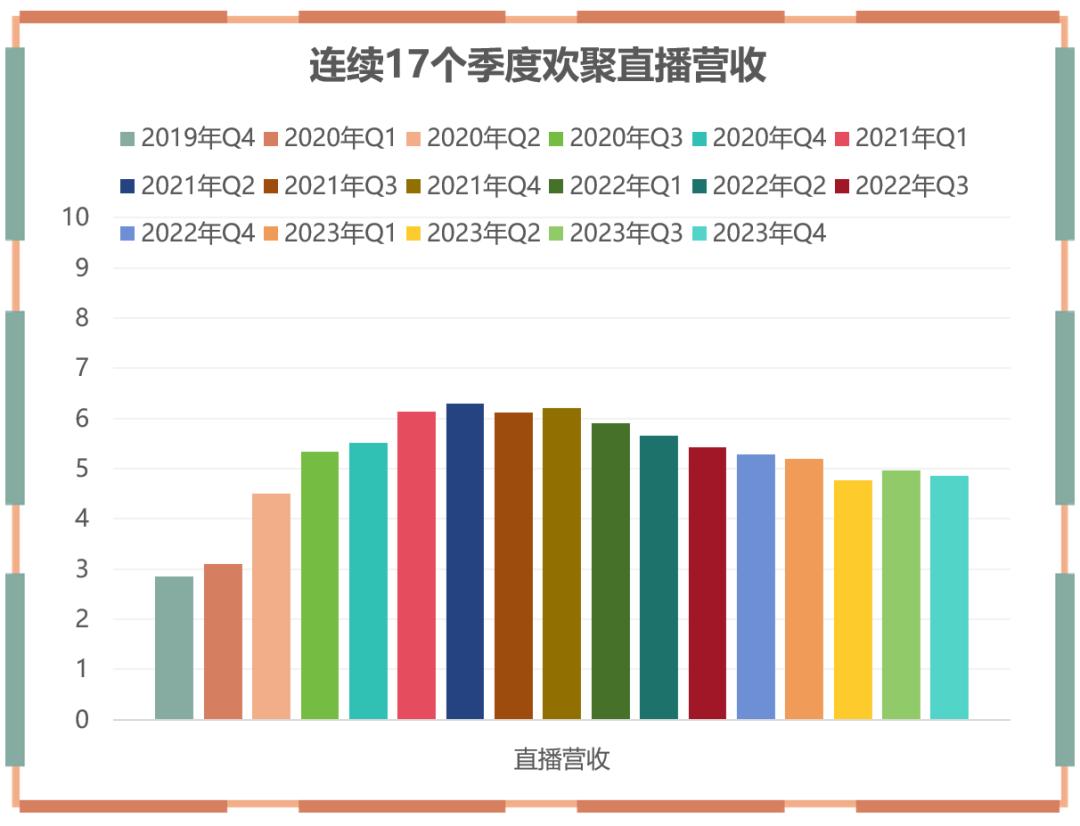 尽管观察其他泛娱乐上市公司的财报或者从第三方统计的营收数据来看,Q4 的营收获取似乎确实相对困难,但综合欢聚过去几个季度的财报数据,“直播营收增长乏力”的情况仍未能解决。作为直播营收的头部代表性产品,在日益激烈的注意力争夺中,欢聚似乎暂时未能找到很好的解决方案,欢聚在财报中提到 2024 年将不断驱动产品以及运营创新,挖掘、深化新的变现模式。