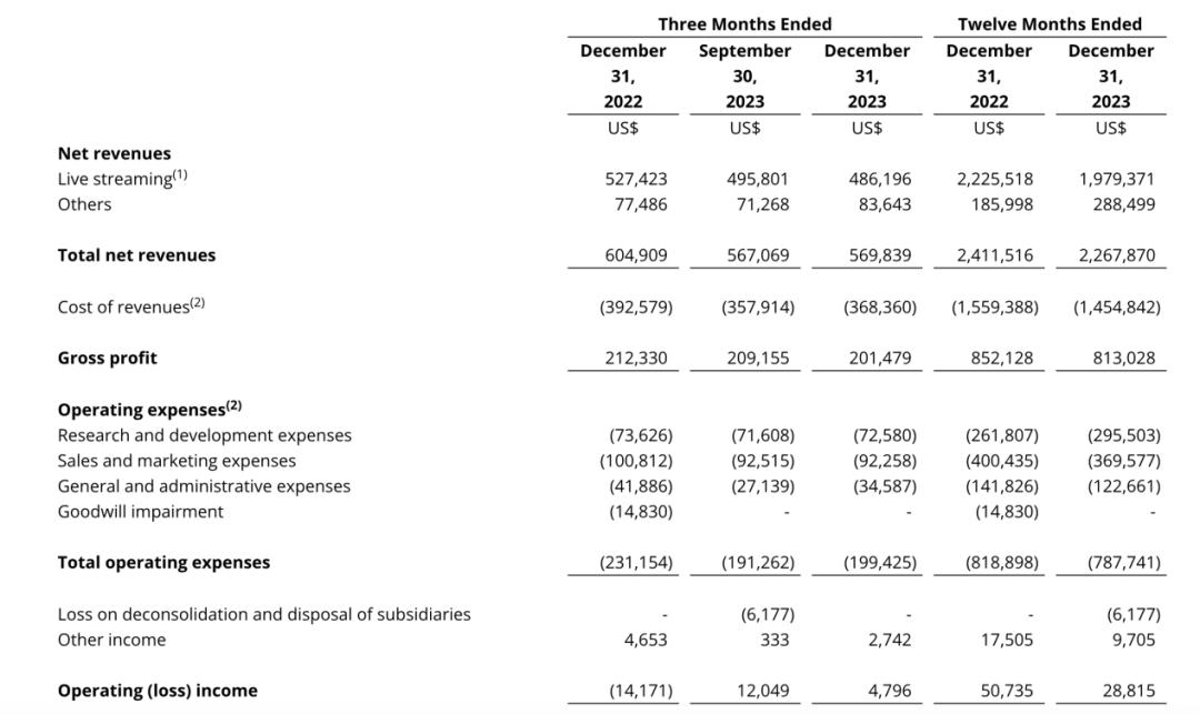 欢聚还在分析师电话会议上提到,2024 年将持续优化成本结构,进一步提升运营和管理效率,同时适当投入一部分资源到推动营收增长和符合长期战略规划的业务方向中。