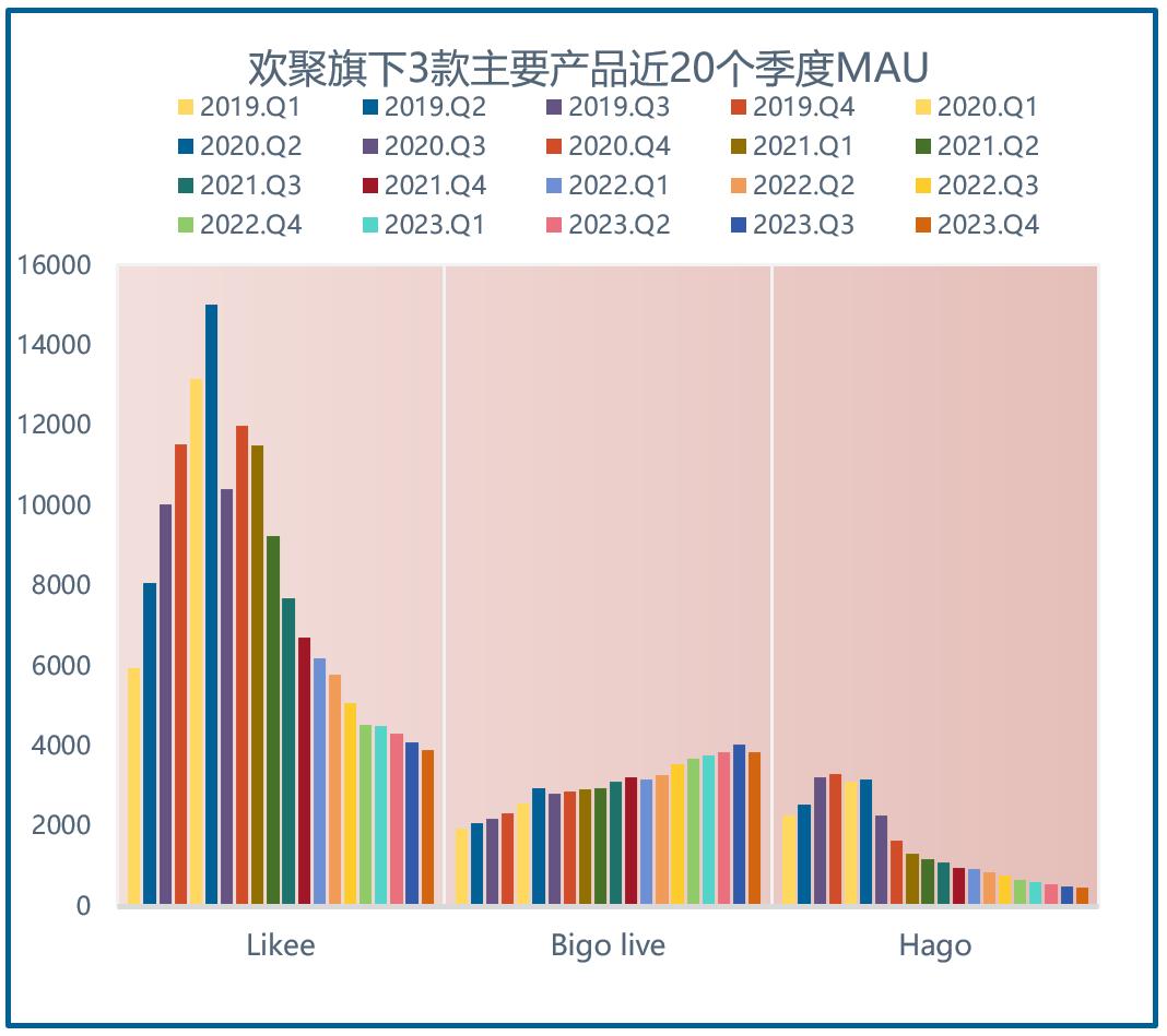 另外,Likee 的 MAU 也出现了一定的下降,2023 年 Q4 Likee MAU 为 3910 万,较上个季度的4100万环比下降 4.6%。Hago 也从上个季度的 500 万进一步缩减至 460 万,三款旗舰产品的 MAU 相较上个季度减少了 420 万。