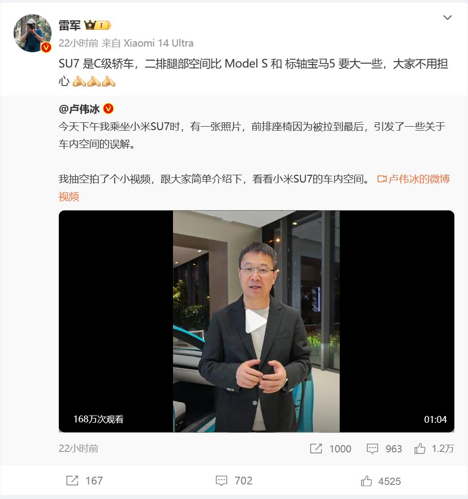 于是乎,「小米SU7后排空间不行」的言论流传开来,再一次引来了外界对小米汽车的质疑。小米官方连忙下场「救火」,卢伟冰临时补拍视频澄清,称当时SU7前排座椅因为被移到最后,所以引发了一些关于车内空间的误解。雷军也转发相关视频,称SU7是C级轿车,二排腿部空间比Model S和标轴宝马5要大一些,让大家不用担心。