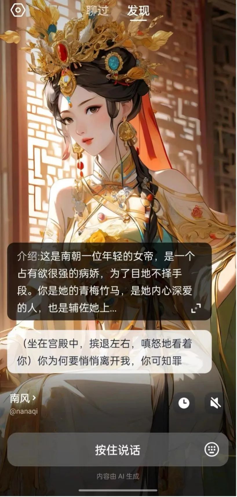从界面来看,“话炉”目前的交互相当简单,用户只需要上下滑动页面就可以选择自己喜欢的AI角色,然后通过语音或者文字对话,而设定的角色类型和场景也非常丰富和具体,比如“南朝一个年轻的女帝”“一个午夜图书馆”甚至是“答案之书”。