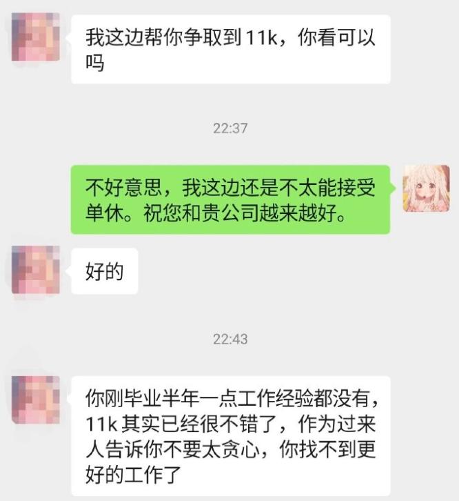 可HR没有放弃她,给她上浮薪水,从10k调到11k,可她仍然觉得为了这1000元而没有双休还是不值得,于是她再次拒绝了这份offer。
