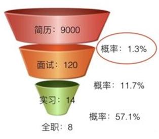 这是某外资投行招聘暑假实习生的数据图,由图中可见,有9000人投递简历,可到了面试环节锐减到120人,这是所有环节中通过率最低的,只有1.3%。千里挑一的概率,意味着绝大多数人就结束在简历环节。