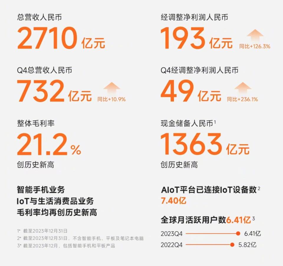 截至2023年12月31日,小米集团现金储备为1363亿元,创历史新高。此外,其首款汽车产品Xiaomi SU7系列的定价将于2024年3月28日正式公布。