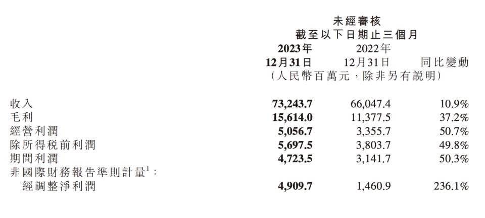 毛利由2022年第四季度的114亿元增加37.2%至2023年第四季度的156亿元。毛利率由2022年第四季度的17.2%增加至2023年第四季度的21.3%。