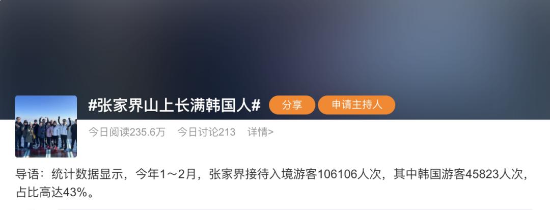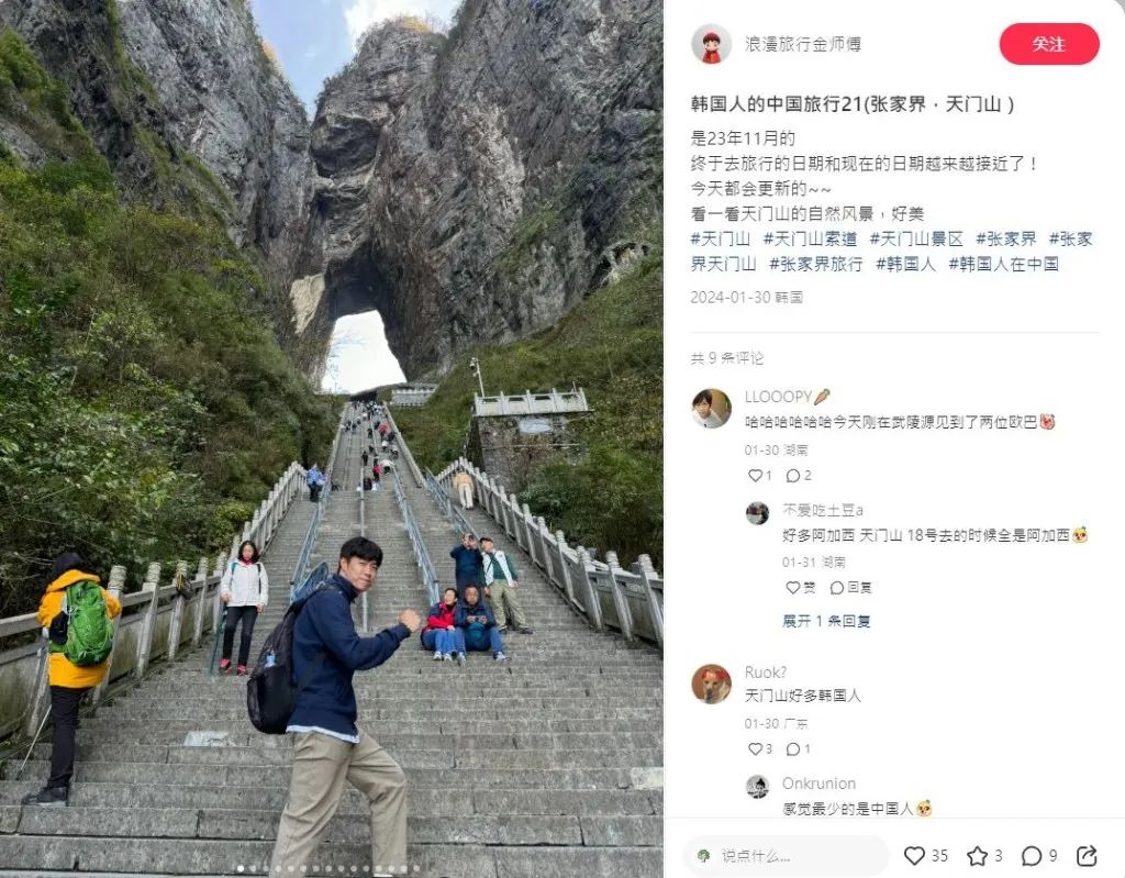 从2023年下半年开始,类似“韩国人挤满张家界”,“人在张家界,却被韩国人包围”,“张家界成为韩国人尽孝之地”等词条频繁出现在各大平台。来到2024年,这种势头非但没有减缓,反而呈现愈演愈烈之势,二月底元宵节刚过,“赴华韩国游客数量暴增900%”的词条更是登上热搜,再次让国人惊叹不已。