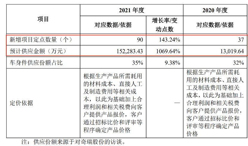 大昌科技回复问询函资料显示,2020年及2021年,大昌科技与奇瑞汽车的新增项目定点数量分别为37个、90个;预计供应金额分别为1.30亿元、15.23亿元。若以此计算,2021年的预计供应金额同比上涨1069.64%。