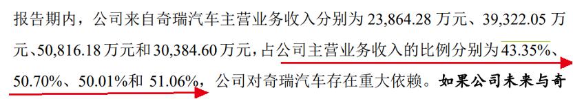 2020年至2023年前6月(以下简称:报告期),奇瑞汽车一直是公司的第一大客户,来自奇瑞汽车的主营业务收入占当期主营业务收入的比例分别为43.35%、50.70%、50.01%、51.06%。