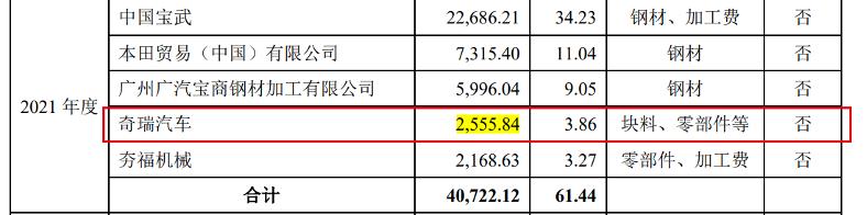 在2021年,公司还向奇瑞汽车采购了2555.84万元块料、零部件等产品,奇瑞汽车也一跃成为了公司前五大供应商之一。