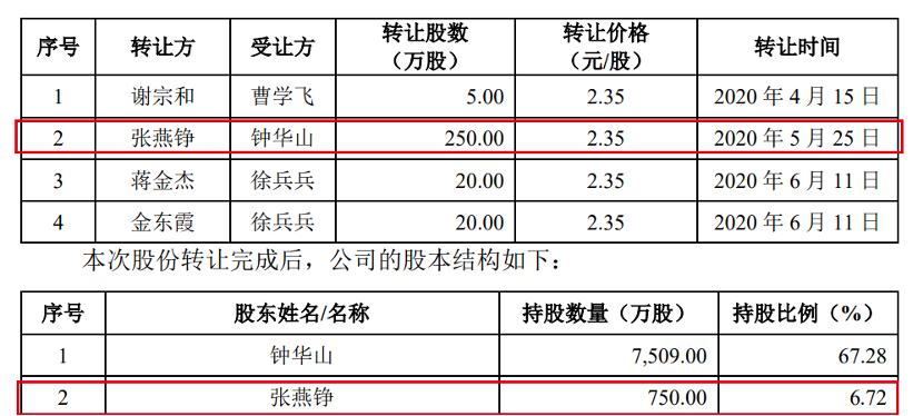 2020年5月,张燕铮向钟华山转让了250万股公司股份,每股单价2.35元,套现超500万元。转让完毕之后,张燕铮仍持有公司6.72%股份。
