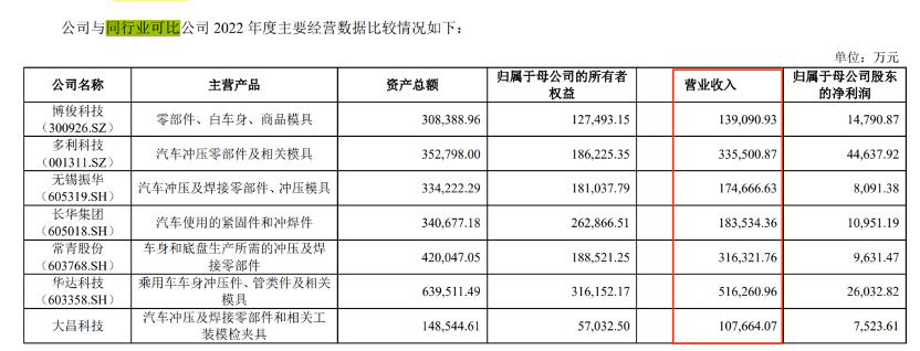 以2022年经营数据为例,同行业可比公司博俊科技、多利科技、无锡振华、长华集团、常青股份和华达科技在2022年的营收位于13亿元至52亿元之间,而大昌科技尚不到11亿元。