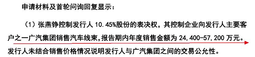 不仅如此,张燕铮控制的公司和大昌科技有着共同的客户——广汽集团。报告期内,广汽集团一直是大昌科技的前五大客户之一。而张燕铮的公司向广汽集团销售汽车线束,报告期内年度销售金额为2.44亿元-5.72亿元。