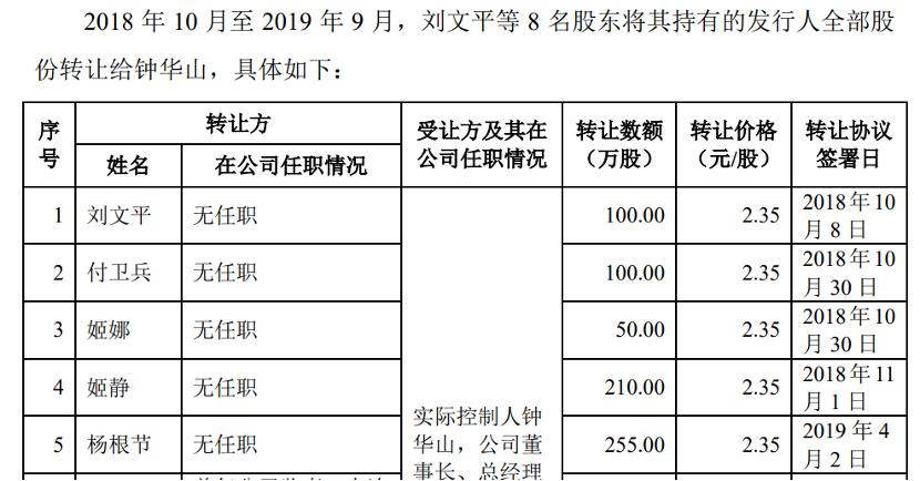 有朋友留在了公司,也有朋友选择套现离场。2018年10月-2019年4月,钟华山的5位朋友将所持全部715万股份转让钟华山,转让价格为2.35元/股,套现超1600万元。