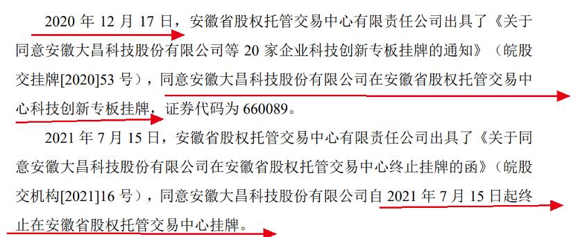 签完对赌协议之后,大昌科技并未直接向A股递交招股书,而是选择在安徽股权托管交易中心挂牌。2020年12月,安徽省股权托管交易中心同意大昌科技在其科技创新专板挂牌。