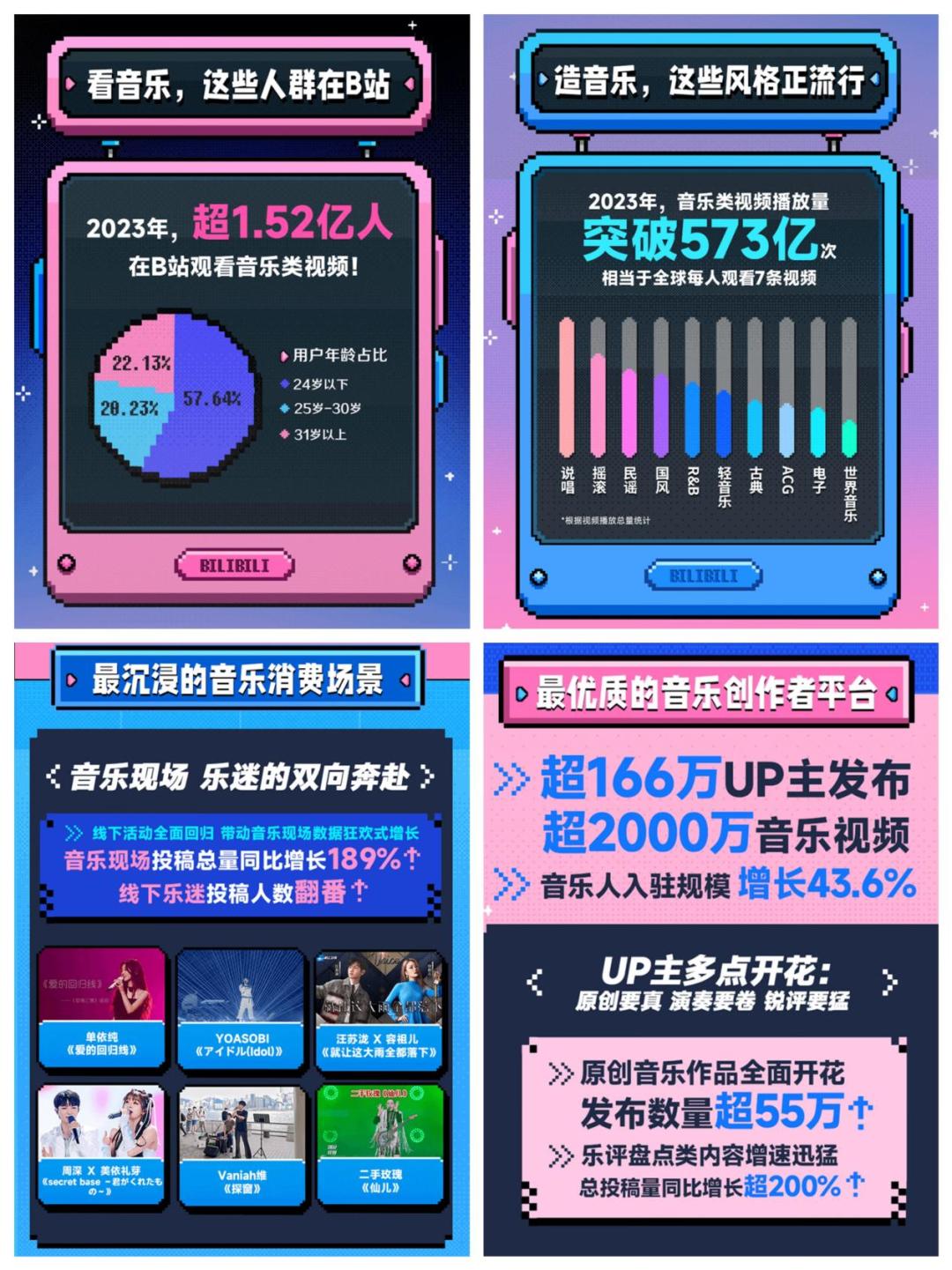 《2023bilibili音乐生态报告》显示,2023年有超过1.52亿人在B站观看音乐类视频,播放总量突破573亿次;2023年B站音乐现场相关视频投稿人数翻番,投稿总量同比暴涨189%;全年大咖音乐人×UP主跨界企划超百次,音乐现场活动合作超1100场;超过1500位全球明星歌手入驻B站,新歌MV上线近3万首。