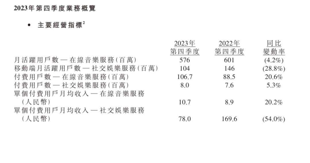 2023年,腾讯音乐来自于社交娱乐服务及其他业务的营收同比下滑34.2%至104.3亿元,同时集团2023年全年收入同比下滑2.1%至277.5亿元。