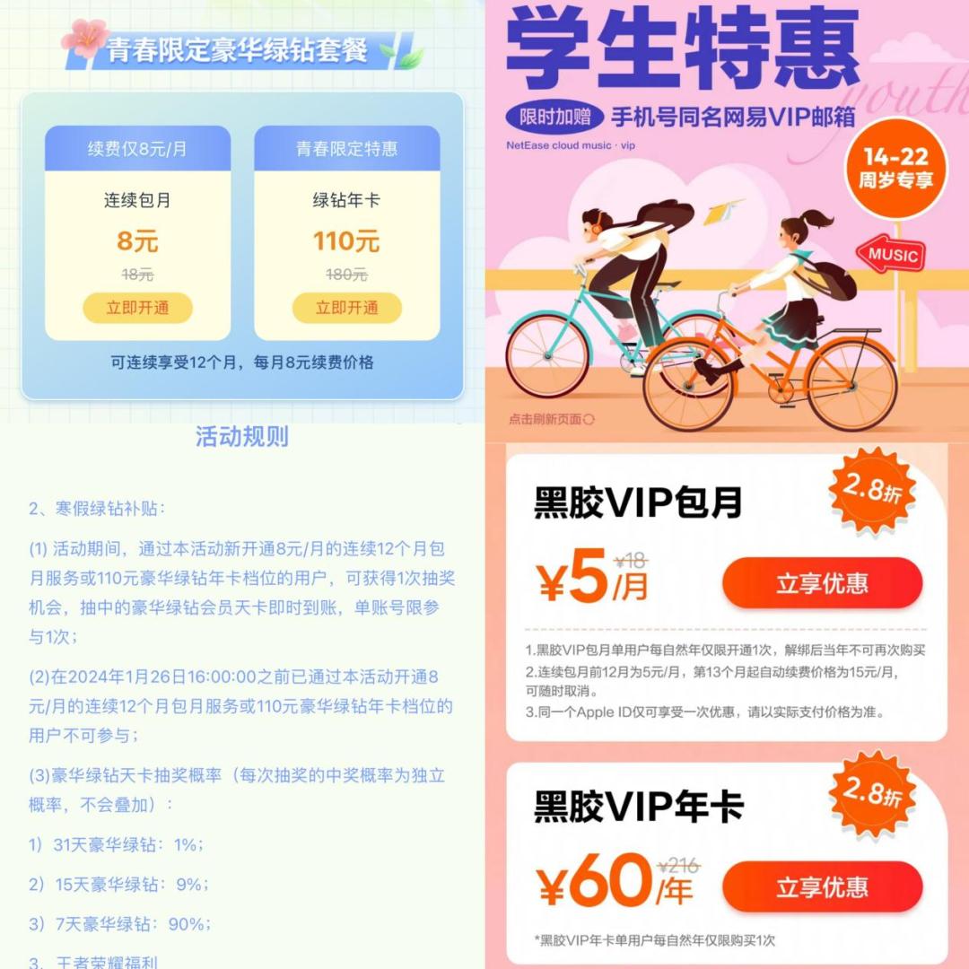 不过,对比网易云音乐,QQ音乐的学生会员同样不具备价格优势,但年龄设定范围较广,支持13—24(含)周岁用户,而且福利更为多样化。
