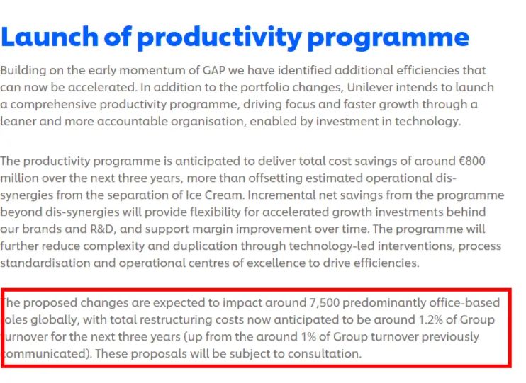 对于此次裁员,联合利华在相关公告中表示,裁员计划是基于即将推出的一项全面的生产力计划,即通过在未来三年内节省约8亿欧元(约合人民币62.5亿元)的成本,聚焦在品牌、研发上的技术投资,打造一个更精简、更负责任的组织,以进一步提高效率和降低成本,推动企业增长。