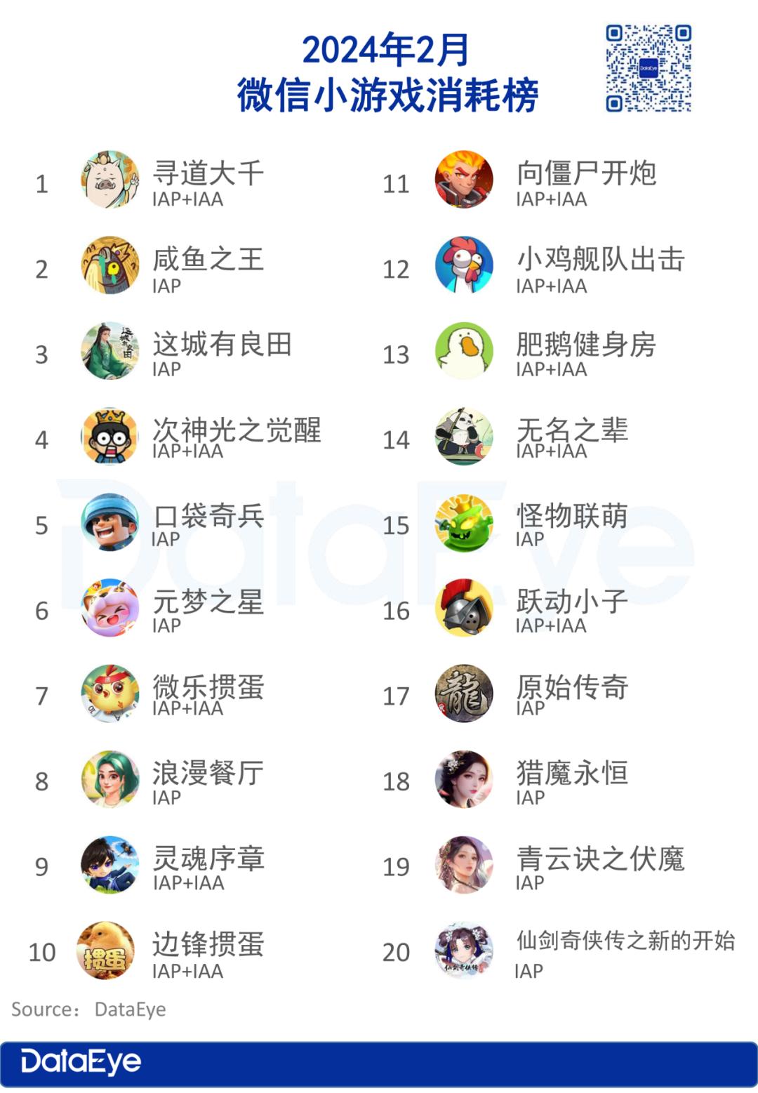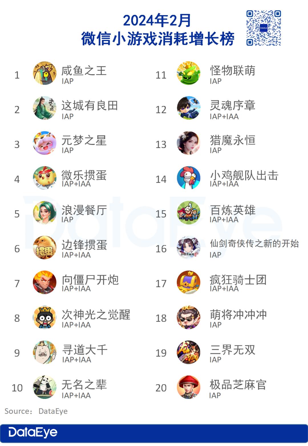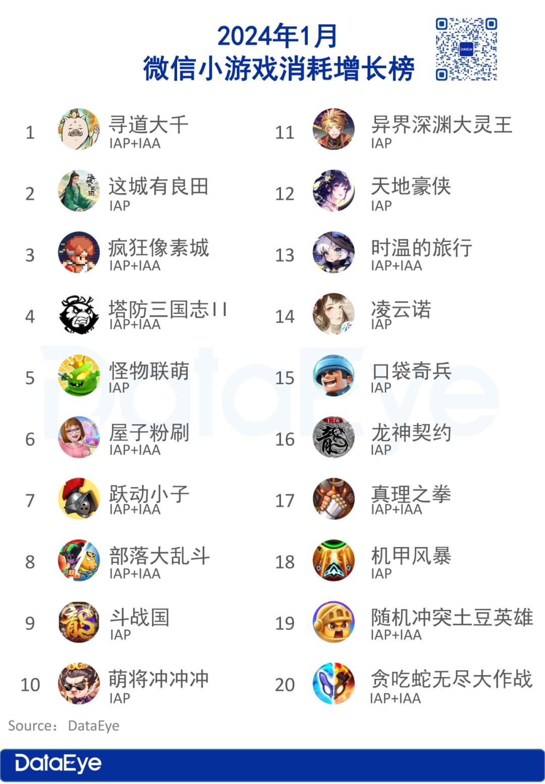 从消耗增长榜来看,进入2月小游戏头部厂商豪腾再度发力,旗下王牌产品《疯狂骑士团》回归增长榜TOP20。益世界《这城有良田》连续两个月都排名消耗增长榜第二,持续领跑模拟经营赛道。
