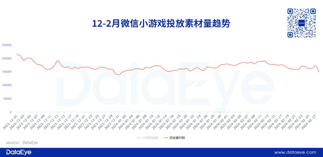 素材量方面,1月微信小游戏日均投放素材有所下滑,但2月日均投放量再创高峰。