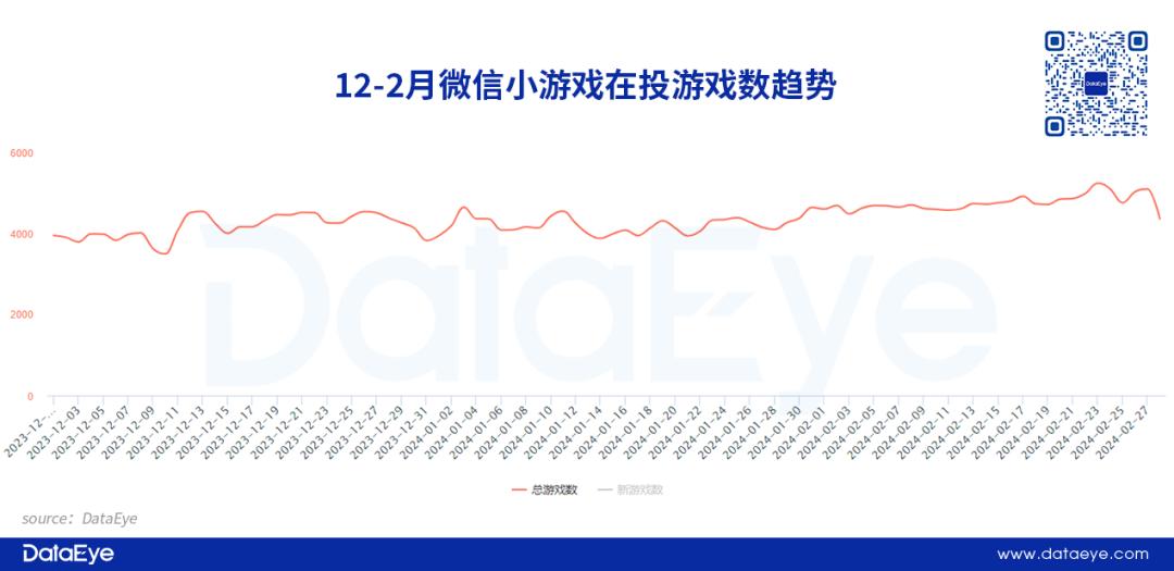 投放游戏数方面,1-2月参与投放的微信小游戏持续上涨,2月23日在投游戏数达到峰值,单日在投游戏数超过5200款小游戏。
