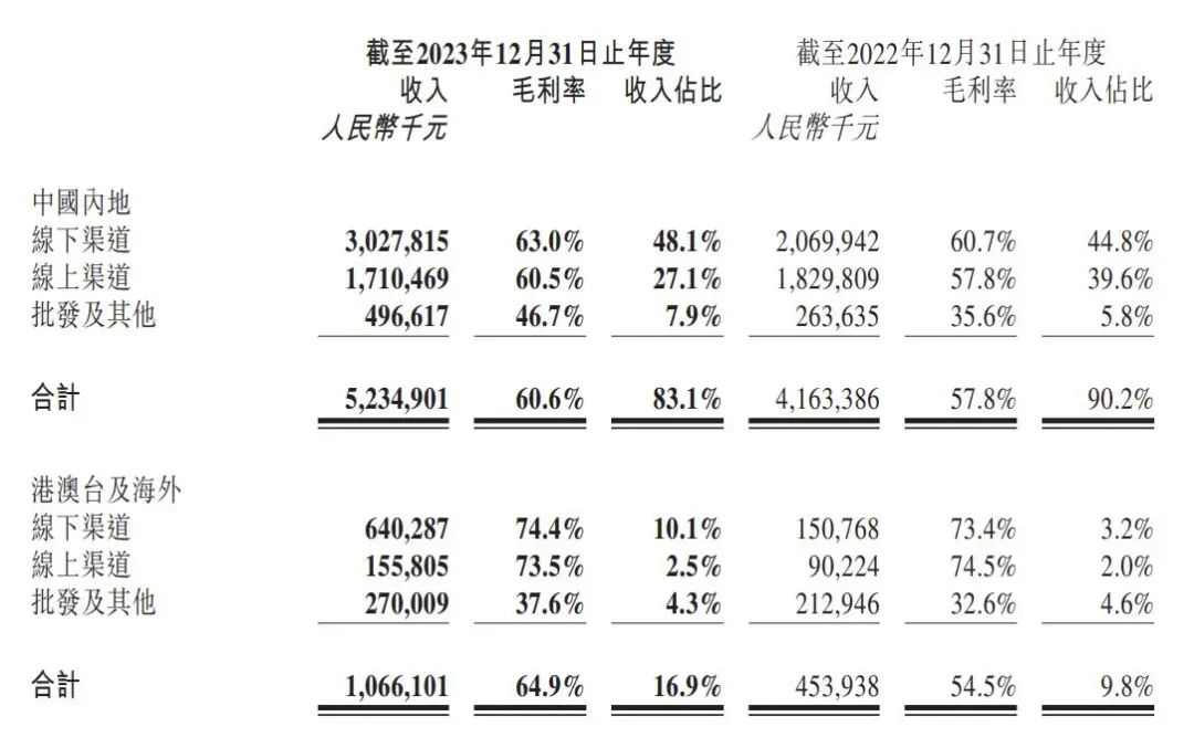 具体来看,零售店销售收入从2022年的16.91亿元增加到2023年的24.79亿元,同比增长了46.6%。内地零售店数量同比增加34家,截至2023年12月31日,合计零售店363家。