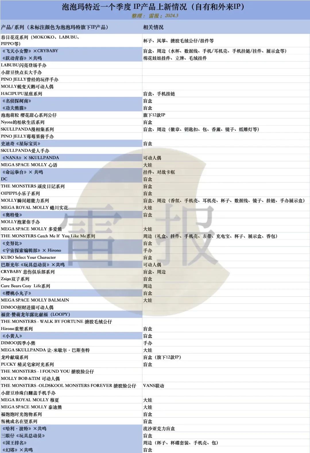 在打造IP联名款产品方面,泡泡玛特也在持续输出。据雷报在此前关于潮玩IP联名的报道中的不完全统计,仅在2023年的12月,泡泡玛特就官宣或直接上线了近20款IP新产品,基本每周都会有上新,甚至出现有同天开售好几个系列的情况。而在过去一个季度,泡泡玛特共计有近60款IP新产品上市。