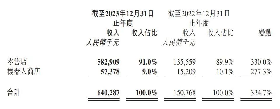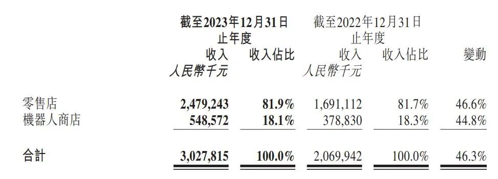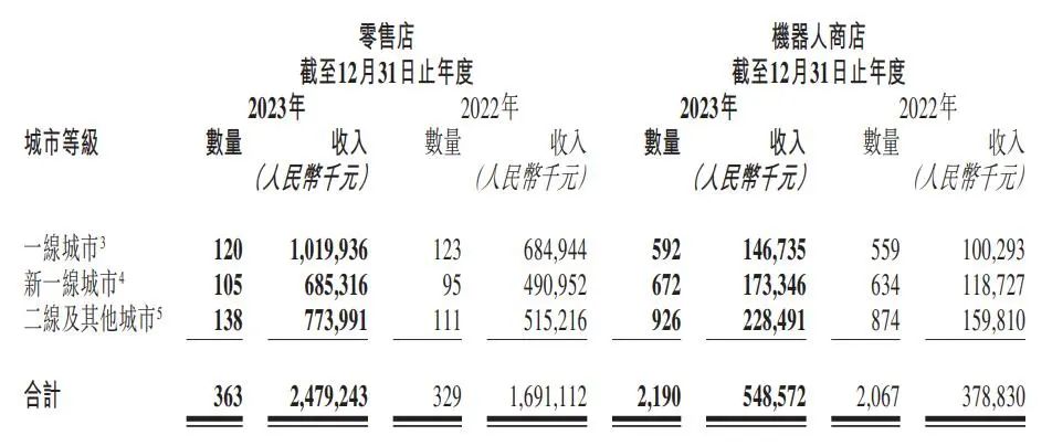 机器人商店销售收入从2022年的3.79亿元增加到2023年的5.49亿元,同比增长了44.8%。内地零售店数量同比增加123间,截至2023年12月31日,合计零售店2190间。
