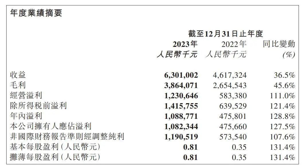 2023年全年,泡泡玛特实现营收63.01亿元,同比增长36.5%,净利润10.89亿元,比去年同期大幅增长128.8%,经调整净利润11.91亿元,同比增长107.6%,营收、净利润均创造了历史新高。