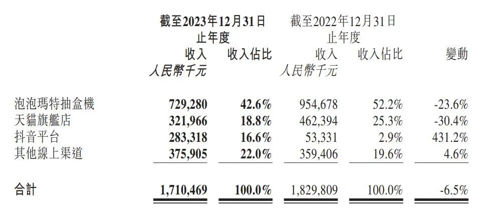不过,在抖音平台,泡泡玛特实现了431.2%的巨幅增长,从2022年的5333万元增长到2023年的人民币2.83亿元。