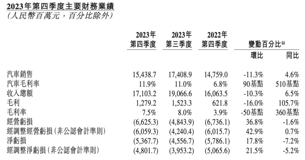 自然而然,降本增效也成为当前新能源车企发展过程中的重要主题。比如,2023年11月,蔚来确认裁员10%,并将对三年内不提升财务表现的项目,进行推迟或削减。这些举措也取得一定成效,财报显示,2023年第四季度,蔚来整车毛利率11.9%,连续两个季度达到两位数,领跑行业。