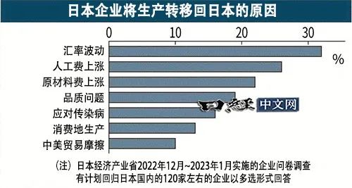 实际上,仅仅因为地缘政治学风险就加快回归日本国内的可能性就很小,关键是成本。日本经济产业省2023年公布的针对日本制造业3455家企业的调查数据表明,有意从国外迁回日本的116家企业中,转移的理由最多的是汇率波动(32%),其次是人工费上涨(26%)及原材料费用上涨(22%)。
