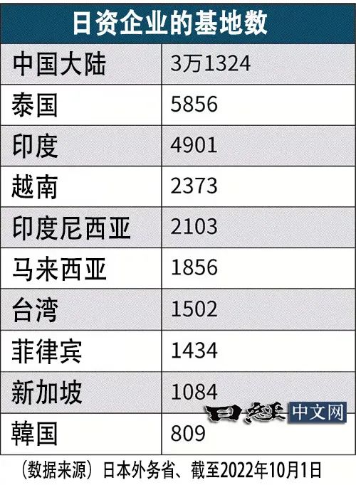 在海外的日本法人基地数量中,中国占压倒性优势。日本外务省发布的2022年日资企业基地数量显示,中国大陆有31324家,不仅在亚洲,在全球也最多。