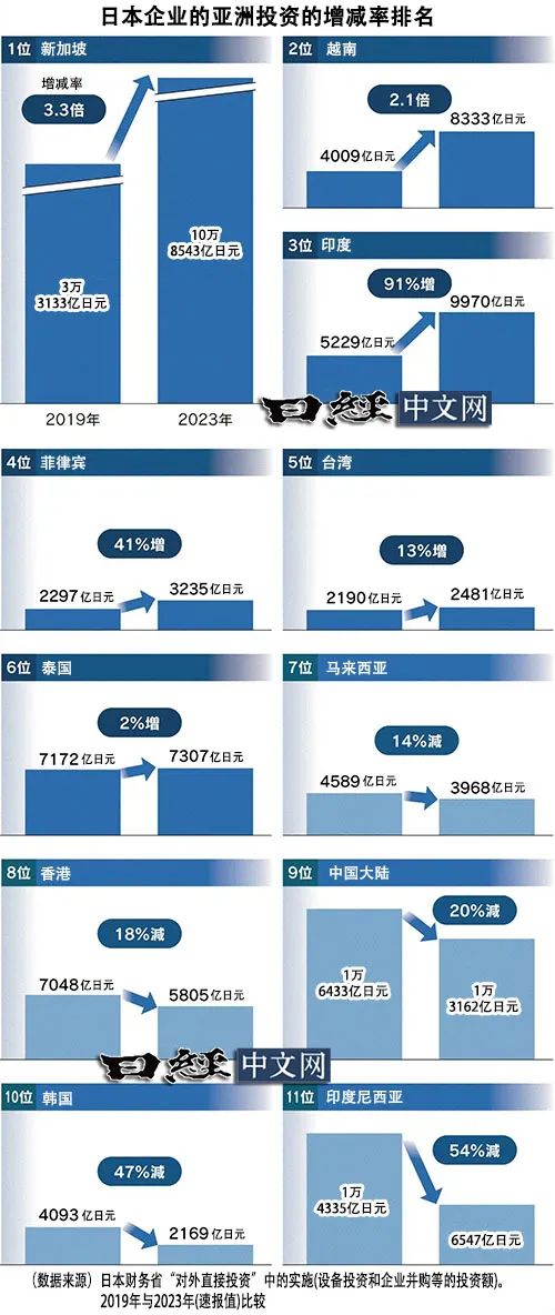 日本企业正在增加投资的亚洲国家和地区有哪些?日经借助国际收支数据,针对日本企业在海外直接投资的金额,按疫情前的2019年和2023年进行比较,排出了增减率排行榜。投资额增长率排在第2的是越南,增至2.1倍。排在首位的是……
