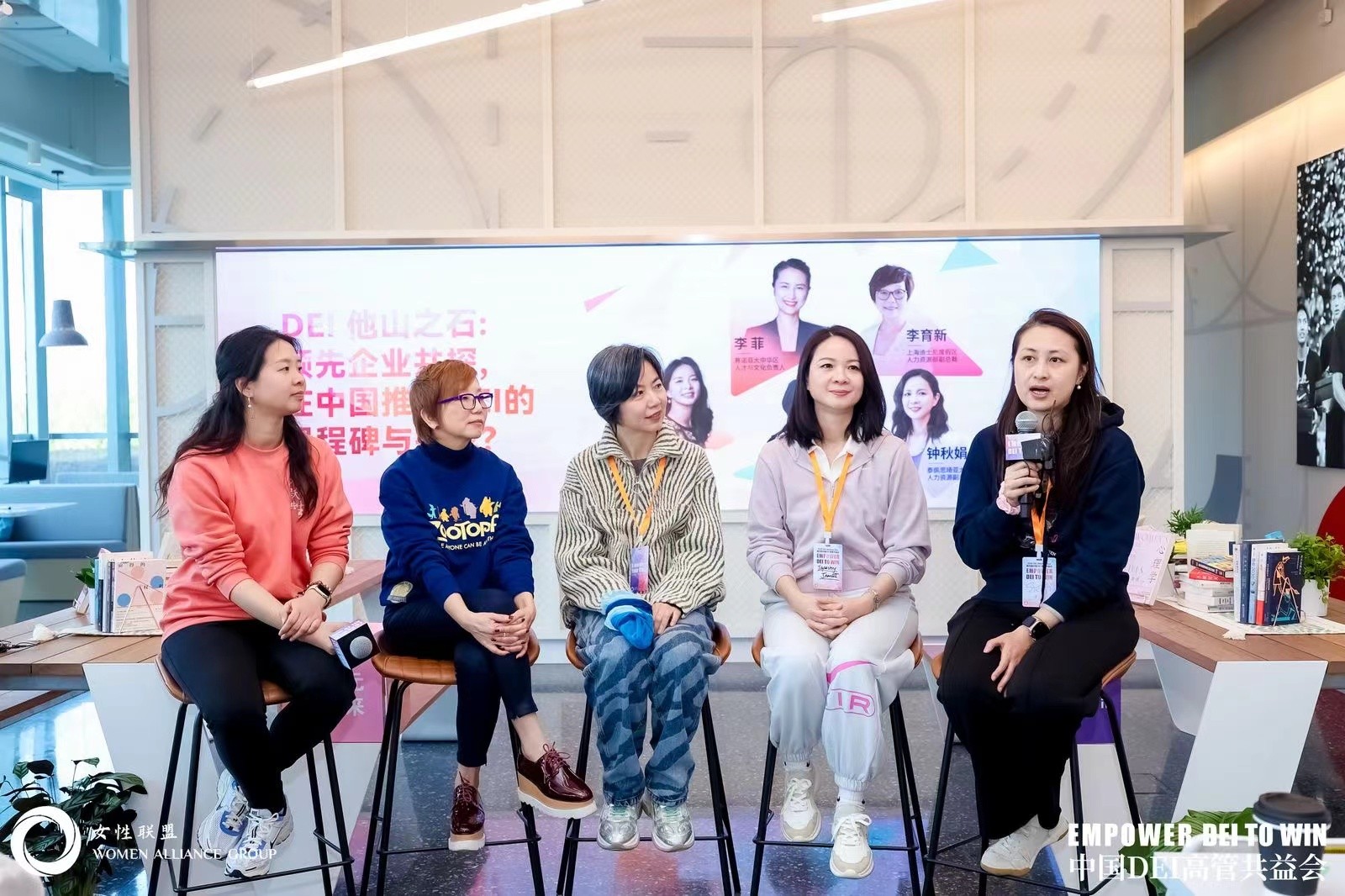 DEI 他山之石圆桌:领先企业共探,在中国推动DEI 的里程碑与挑战。从右往左依次为李菲,钟秋娟,尹东平,李育新,陈永敏
