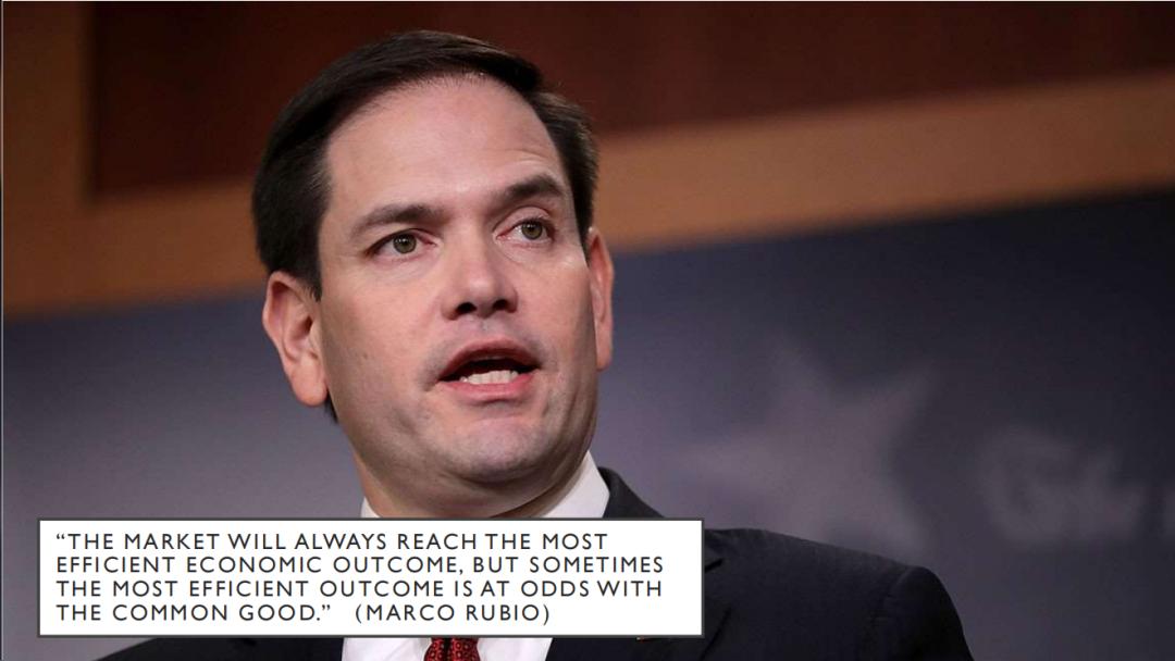 我在这里引用一句话,是 Marco Rubio 所讲的,美国的一个著名的议员,他说:“The market will always reach the most efficient economic outcome.”市场总会带来最有效率的经济结果,“But sometimes the most efficient outcome is at odds with common good.”但经济效率不一定符合共同的利益。利益是多样的、多元的,所以我们不可能只把商业上、经济上的效率作为社会发展的唯一的考虑。这就是我刚才所说的,全球化它是一个自由化的结果,在70年代以后,那时候经济效率和市场效率变成了首要目标(top priority)。但是现在这样的一个经济范式或者理念在发生一个根本性的变化,这是我们现在必须要正视的一个问题。