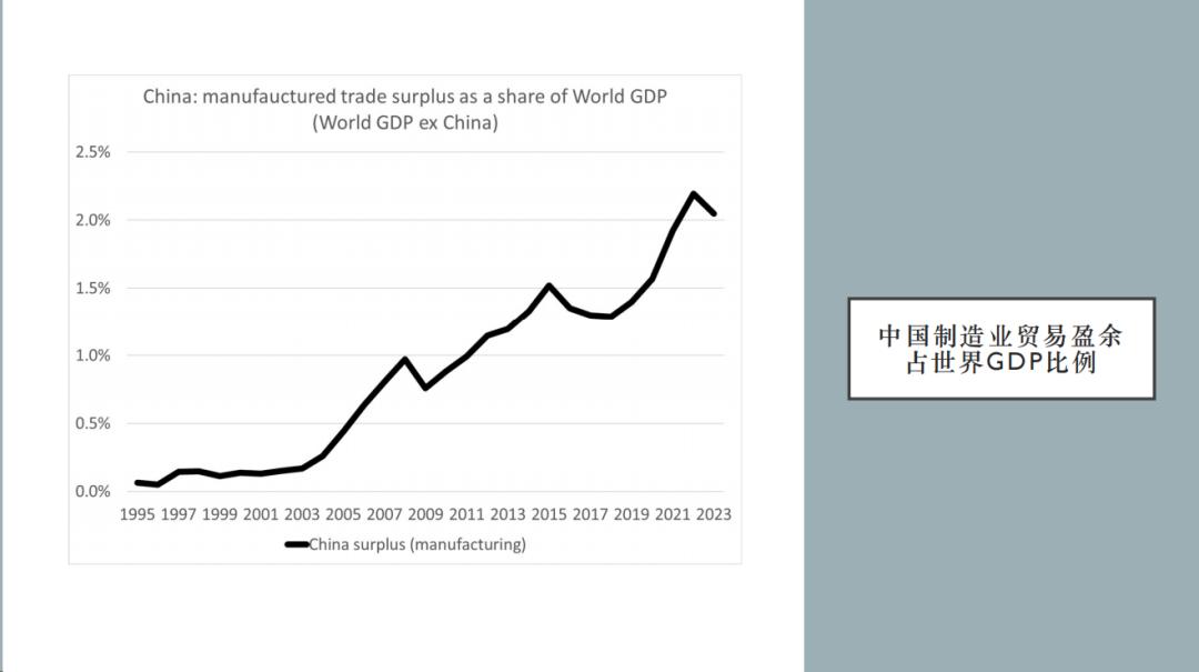 请大家再看一张图,中国制造业的贸易盈余占世界 GDP 的比例是多少呢?世界经济的总产值里边有2%是来自于中国的制造业的贸易盈余。这是一个什么概念?2%的世界 GDP 是中国产出的制造业上的贸易盈余。说得直白一点就是,你都干了,那别人干嘛?就是这样的一个简单的问题摆在面前。这样的状态,一个我们可以预见到的结果,是保护主义和贸易壁垒的不断深化。