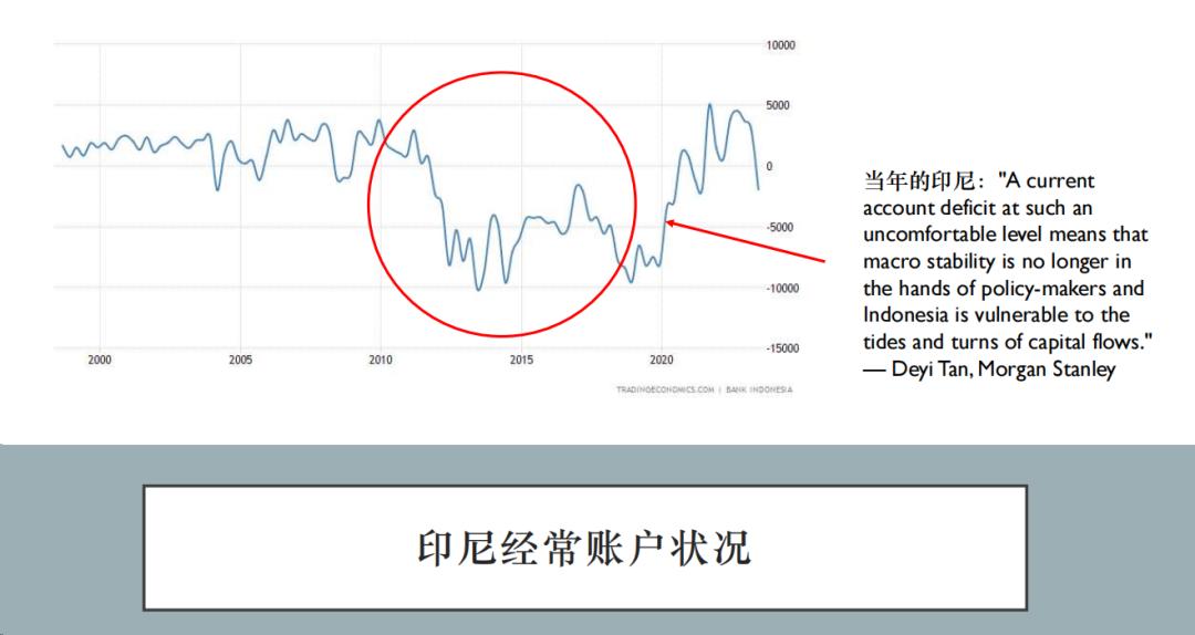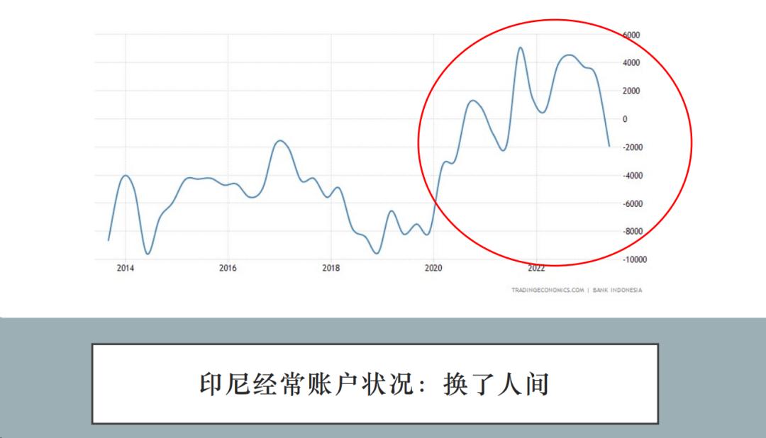 Deyi Tan,这个人是 Morgan Stanley 的首席汇率策略师,当时他讲了这么一句话,变成了一个经典案例,他说:“当你的经常赤字账户的赤字达到了如此不适的水平,当时这个状况恶化的程度已经超过了1998年的亚洲金融危机了,你宏观经济的稳定性就不再掌握在政策制定者的手中,对国际资本流动的潮起潮落是无能为力的。”所以2013年的时候印尼是一个反面的典型。但是这些年它发生了多么大的变化,我们去看它的经常账户,也就是它的总体贸易状况,已经出现了一个天翻地覆的变化。作为一个观察者,我只能从宏观的角度去看,我个人会认为,2024年到2025年,印尼的经济状况会非常不错。
