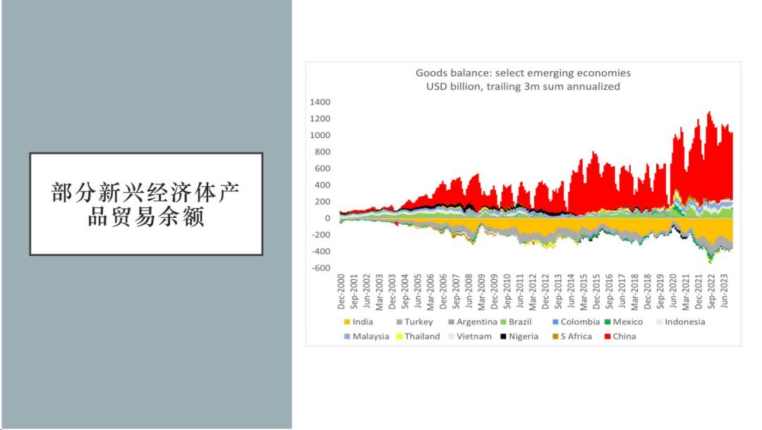 现在请大家看两张图,第一张图这是主要的新兴经济体的产品贸易的余额,就是出口减去进口,红色的是中国。在出口这件事上,你基本上就可以这么认为:中国,和其他。