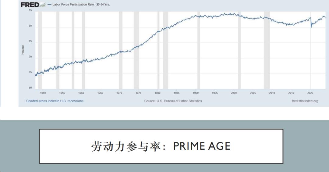 刚才说的是需求方面的问题——劳动力市场上有很多的岗位找不到人,另外我们去看一看供给方面,这是美国劳动力市场上的 prime age(25岁到54岁)人口群组在劳动力市场上的参与率。一方面是劳动力市场上还有900多万个工作岗位找不到人,另外一方面是说该出来工作、有能力工作的人基本上全出来了。所以工作是非常好找的,问题是找不到人,这就是为什么消费需求一直都在。现在在美国纽约,去火锅店做一个服务员,年薪可以达到15万美元。这种状况带来的结果是,消费需求仍然会得到一个非常强有力的支持。