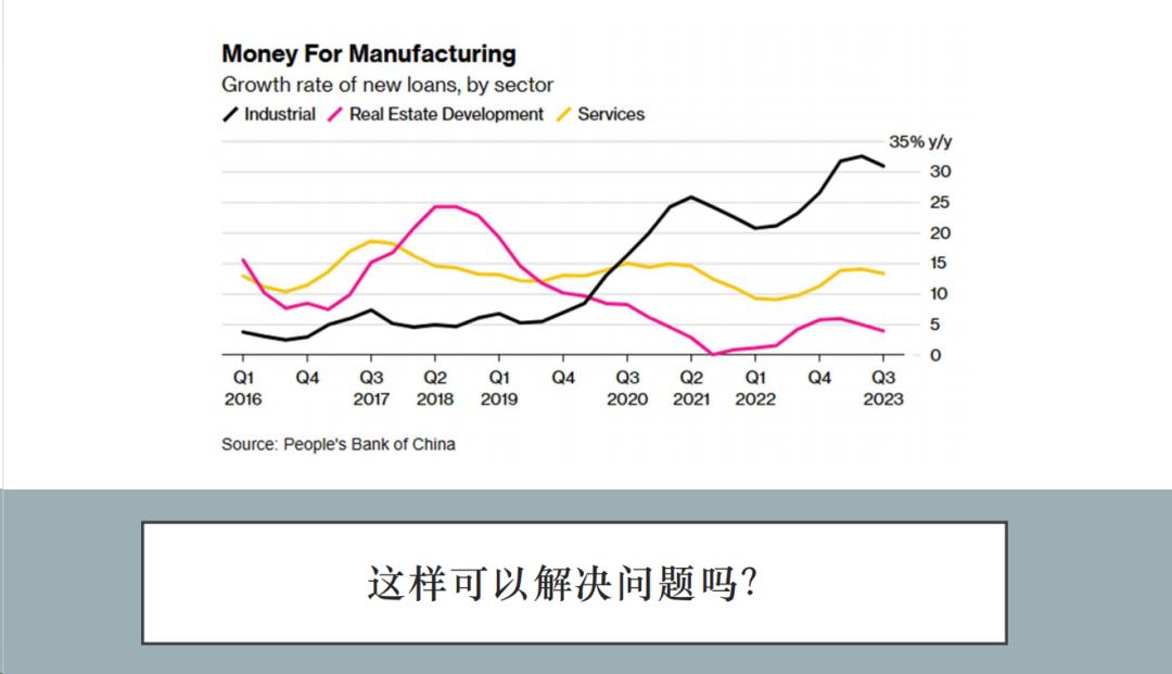 这张图里的黑线就是工业的贷款的增长,现在房地产与基建在下行的时候,贷款来源主要集中在这个地方。经济疲软需要刺激,就要发放更多的贷款,贷款又到了供给侧,产能在不断地扩张,但是居民的收入并没有得到实际的增长,所以消费需求是有限的。一边是有限的消费需求,另外一边是无限增长的工业产能,这两者之间的不匹配,它是一个在短期之内很难去面对的挑战。