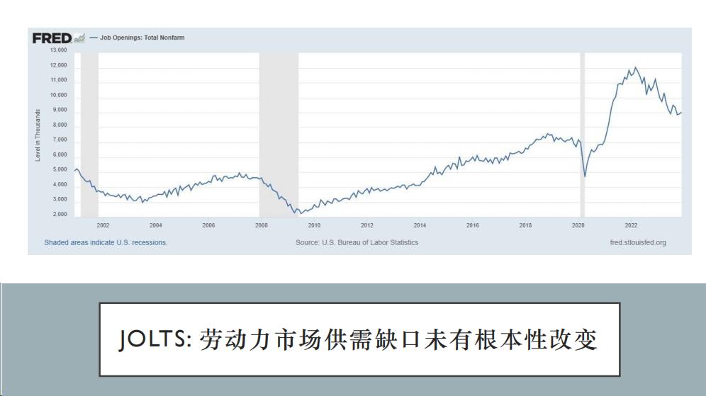 从另外一个角度来讲,我们还知道一件事:一边有900万个工作岗位还没有找到人,另外一边是在25岁到54岁这个年龄段里边,该出来工作的人都出来了,他们不是在工作就是在求职。劳动力市场上的供求缺口仍然是这么大的话,工资会发生什么样的变化?是会继续涨对不对?如果工资继续再涨,就意味着人力成本的持续提升,人力成本的持续提升一定会转变到物价上——这就告诉我们美国的通胀很难出现一个根本性的变化。这也就告诉我们美联储未来未必就会很快的降息。这是我们可以看见的一个图景。