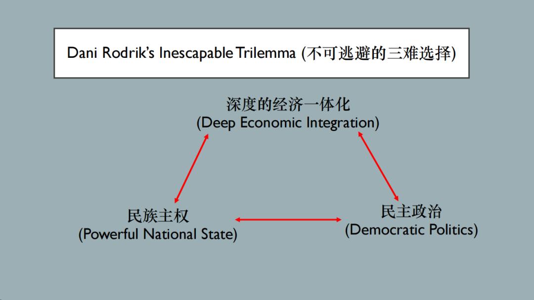 但是这样的一个过程,产生了几个非常有趣的结果,请大家看一看。超级全球化在很长时间里被认为是一个必然的结果:资本、产品自由流动,经济在变得越来越自由,人的脚也摆脱了束缚,世界要大同了。但是这样的一个超级全球化的梦想,它会面对一个根本性的问题。这就是 Dani Rodrik 说的不可逃避的三难选择的问题。Dani Rodrik 告诉我们,全球经济治理面对的一个三者取其二的三难选择。三者是什么?第一个是深度的经济一体化(Deep Economic Integration),就是经济全球化。第二个是民族主权(Powerful National State)。那么第三个就是民主政治(Democratic Politics)。我把它做一个简化:我认为民主政治所产生的作用是非常微妙的,这是过度复杂的框架,我把它拿掉。那么在我看起来,也就不是一个三者取其二的问题,就变成了深度的经济一体化和民族主权之间二选一的问题。