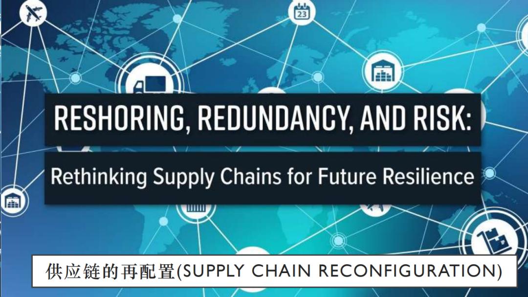另外一个大家现在经常谈到的现象,就是所谓的供应链的reconfiguration,供应链的重置、再配置的问题。供应链重置其实这个话题已经谈了很多年了,从当年奥巴马时代就已经开始谈,直到疫情变成了一个催化剂。我们也经常听到很多的词,比如说像什么 redundancy 冗余,过去生产制造经常讲要追求效率,要的是一个just in time,你少备存货加快周转,需要的时候再进来,以需求来推动生产;现在谈的要多一点冗余,多备一点货以备不时之需。以前讲的是 just in time,现在讲的叫做 just in case,万一发生点事你怎么办?以前讲的是效率,现在讲的是安全供应链,已经上升到了一个安全的角度。