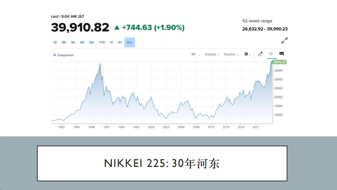 近日,大家对日本的关注度非常高。日本的股市 NIKKEI 日经225指数的数值是39,000多,接近4万。我们跟历史做一个对比,上一个高峰出现在1989年的10月初。30多年过去了,日本经历了一个泡沫经济的破裂,从3万8900多点一路落下去,经过了所谓的失落的30年,现在又回到了接近4万的水平,达到了一个新的峰值。所有人都在说日本经济好像要起飞了,包括岸田政府都在讲日本经济可能要迎来起飞。对此我简单地评价一下。