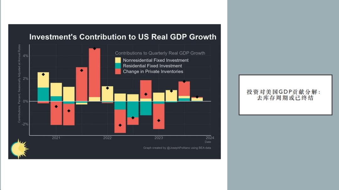 我们刚才看了消费,我们再看一看美国的投资。投资在过去两年的时间里边,基本上对美国经济增速是一个拖累,它起到了一个非常明显的 headwind,就是顶头风。为什么投资会拖累美国经济的整体增长?投资分成三大模块,第一部分简单的说就是工业投资,设备厂房等等;第二部分是居民房地产的投资;第三部分是存货。存货是企业投资的一个模块,也是国民经济里一个非常重要的成分。过去几年时间,美联储把利率已经提升到了非常高的水平,而利率上涨带来了另外一个结果:买房的成本增加,房地产市场出现了一个极大的冷却,所以在2023年美国的 residential,即居民的房地产、居住房地产、住宅房地产的营建许可的数量跟2022年相比下降了26.6%,有1/4的衰退。所以在很长的时间里绿色的 Residential Fixed Investment,居民房地产、住宅房地产的投资在经济增长的贡献都是显著为负的。另外是存货的变化。美国在过去两年时间里边都在去库存,为什么?2021年的时候因为疫情供应链受到了冲击,导致企业一定会囤货,它一定会下很多的订单,产生了一个巨大的需求。但是等到疫情结束,供应链的瓶颈得到缓解的时候,这时候它过度的库存就必须会有一个去掉的过程,它就会降价去库存,它不会下新的订单,那么经济就会受到影响。
