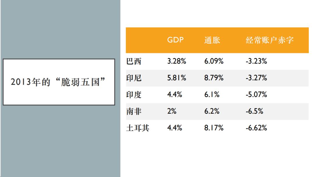 在2013年,当时新兴市场动荡的时候,有一个所谓脆弱五国的说法,印尼是其中之一。看它的汇率的变化,印尼经常账户,也就是它的总体贸易状况,在2013年左右的时间里面是非常糟糕的。