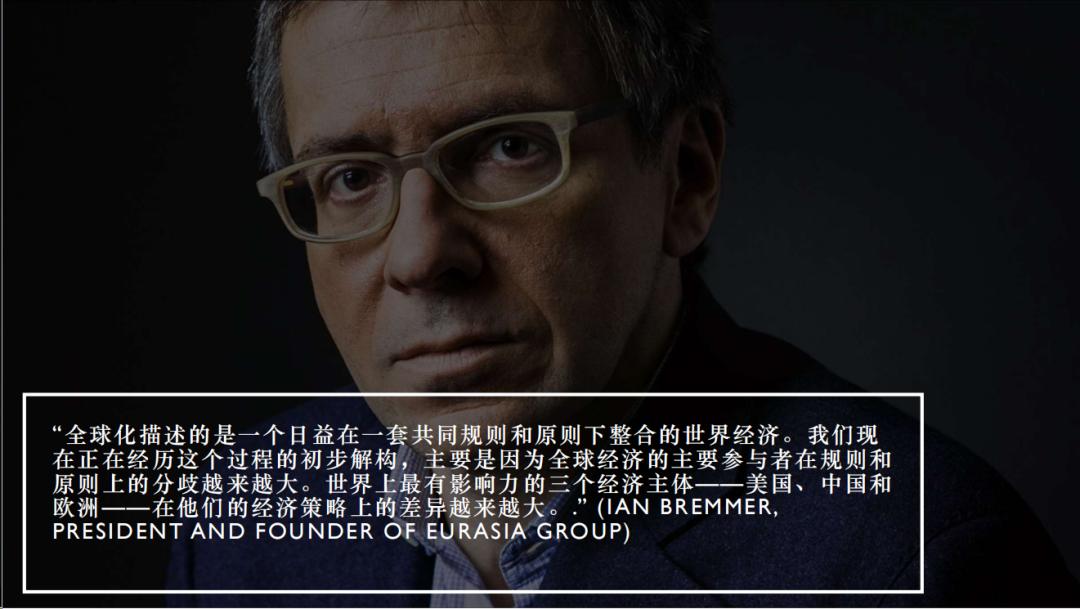 我用这一段话来总结一下,这个人叫 Ian Bremmer,他是 EURASIA 的创始人,他讲了这么一句话:“全球化描述的是一个日益在一套共同规则和原则下整合的世界经济。我们现在正在经历这个过程的初步解构,主要是因为全球经济的主要参与者在规则和原则上的分歧越来越大。世界上最有影响力的三个经济主体——美国、中国和欧洲——在他们的经济策略上的差异越来越大。”这就是我们现在所面对的一个问题,超级全球化的进程,最终它一定会踢到一堵墙,这堵墙就是民族国家的边界。这就是我们现在必须要去接受的一个现实。