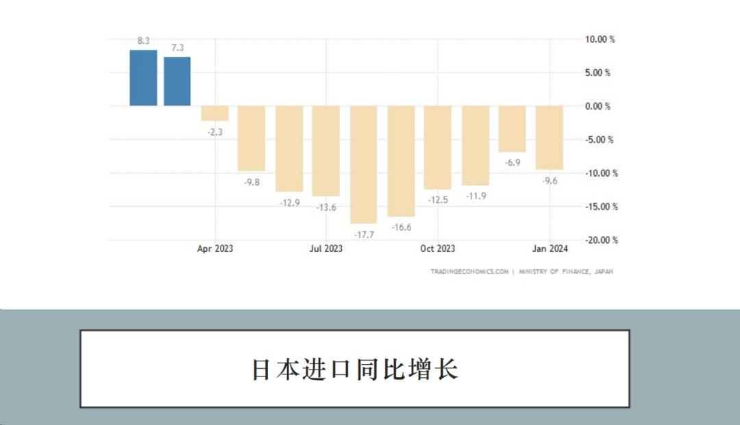 请大家首先看一看这张图,日本经济的进口在过去的12个月的时间里边有10个月是负增长。我们知道 GDP(国民经济生产总值)的统计它分成三个模块:消费、投资和净出口。净出口的定义是出口减去进口,这意味着进口在国民经济的统计之中是一个减项。而日本进口在大幅度的下降,也就是一个减项在下降,相当于总值是在增加。对总值而说这是一个 positive factor(正面因素),实际上这是统计上的因素,所以即使上半年这个数据看起来很漂亮,它也没有说服我。
