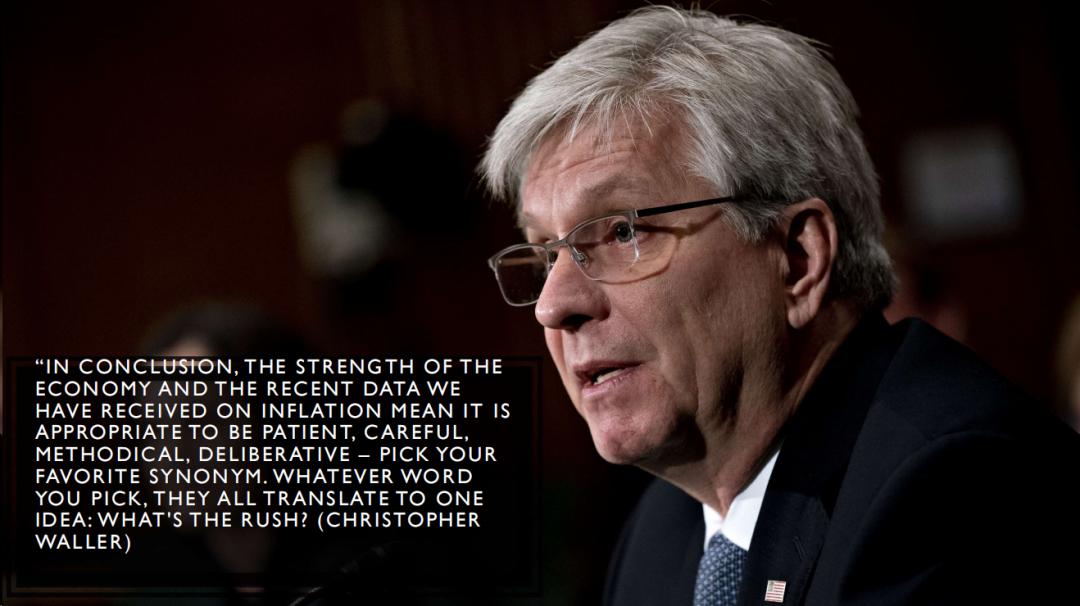 总结一下,这个人叫 Christopher Waller,美联储的一位理事,他对美国当前的经济状况和货币政策前景做了一个总结,他说:“In conclusion, the strength of the economy and the recent data we have received on inflation mean it is appropriate to be patient, careful, methodical, deliberative. Pick your favorite synonym. Whatever word you pick, they all translate to one idea: What's the rush? ” (总之,经济的势头和目前收集到关于通胀的数据意味着我们应该保持耐心、小心、谨慎且深思熟虑。选择你最喜欢的一个同义词,但是不管你选什么,最后都会翻译成一句话,就是“你急什么”。)美国货币政策的放松仍然需要很长的时间,大胆一点的话,我相信最早的时间点应该要到9月份,甚至9月份降息的概率都不会超过50%。美国经济的这种强势,对货币政策产生的影响,我们每个人都会感受得到。货币紧缩会持续很长,这是我对美国的一个简单的评论。